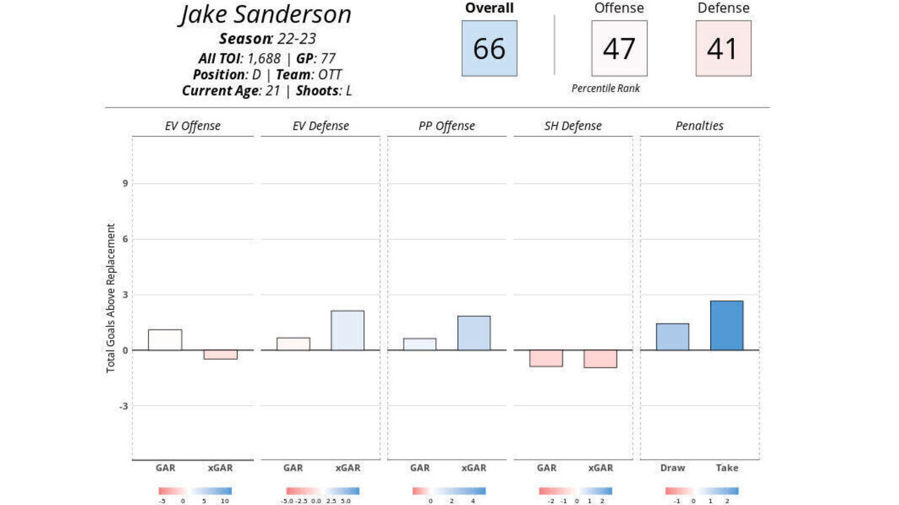 Sanderson was named to the NHL's All-Rookie Team and finished sixth in Calder Trophy voting last season after tallying 32 points in 77 games. The 21-year-old logged the second-most minutes on the team behind Thomas Chabot, averaging 21:55 per contest. He posted decent underlying numbers, highlighted by a strong penalty differential.