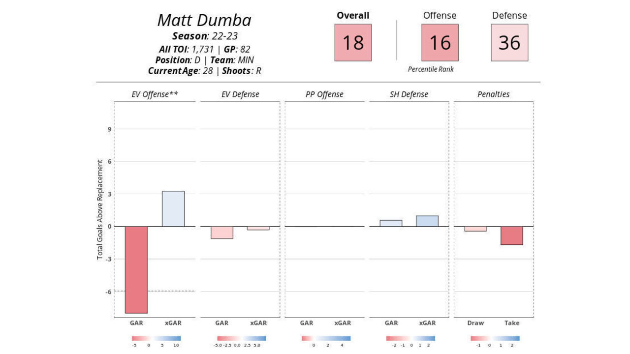 Dumba carries a $6-million cap hit and will be an unrestricted free agent at season's end. He recorded four goals and seven assists in 39 games this season while averaging 21:07 of ice time per contest. His underlying numbers have been poor this year.